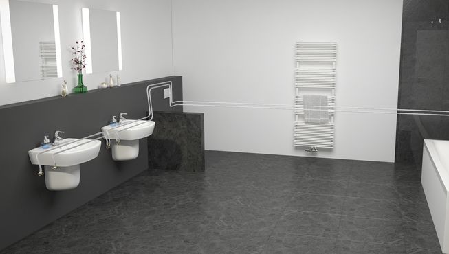 生活供水系统:turatec multi PE-RT耐热聚乙烯多层复合管、alpex-duo XS交联聚乙烯多层复合管、alpex-duo卡压式管件系列、alpex-plus 即插式管件系列
